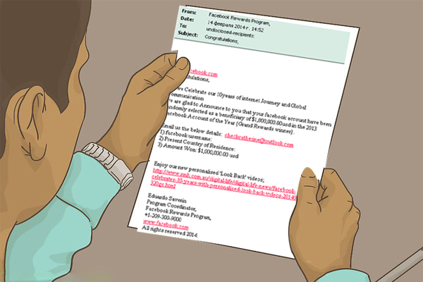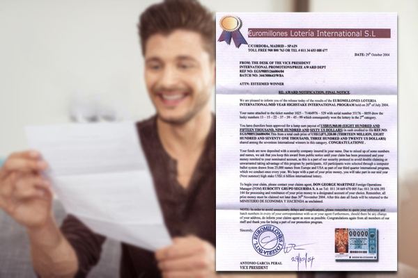 example is illustrated where a fabricated lottery win is claimed, urging the user to contact a fraudulent email address. Subsequently, the user receives emails from this