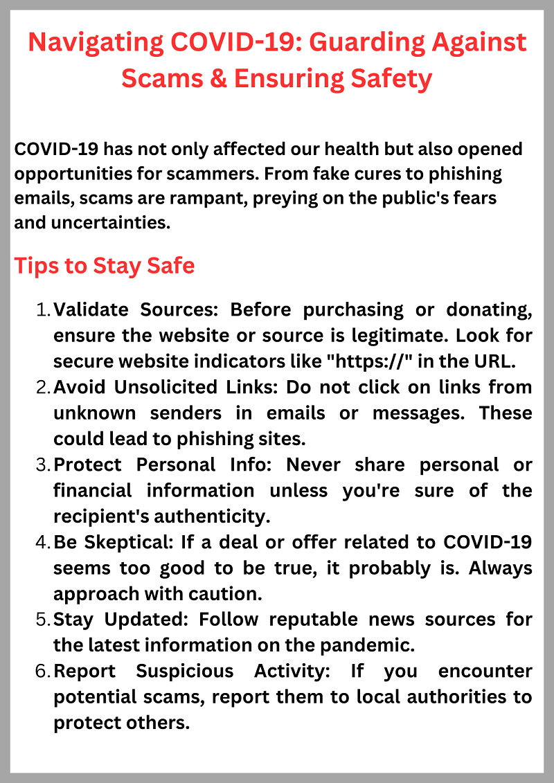 It's important to be vigilant and stay informed about the latest Covid-19 scams. You can report any suspicious activity to the appropriate authorities and if you suspect you have been a victim of a scam, report it to your local law enforcement agency or the Federal Trade Commission (FTC).