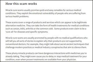 The "miracle cure" scam preys on the vulnerabilities associated with a person's illness. The more severe or concerning the condition, the more likely the individual is to be lured by these scams. Common ailments these scams promise to address include cancer, insomnia, diabetes, weight loss, baldness, memory loss, heart disease, Alzheimer's, and sexual performance. Such remedies are frequently promoted online or through unsolicited emails. Websites marketing these "treatments" often showcase a testimonial section filled with glowing reviews and high ratings from supposed past customers, even though these individuals may never have actually used the products. To further convince potential victims, these sites might also detail alleged clinical trials and research methodologies, aiming to give an air of credibility and authenticity to their claims.