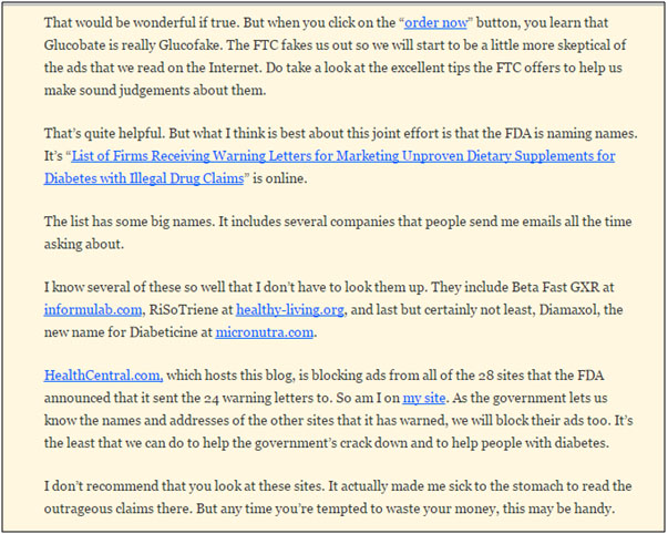 The illustration provided is an exemplar of the so-called "Ultimate Diabetes Scam." Here, a deceptive strategy is employed wherein the product's name changes when the "Order Now" button is clicked. The Federal Trade Commission (FTC) has actively intervened against such misleading practices, issuing warning letters to companies that falsely purport to have a cure for diabetes.