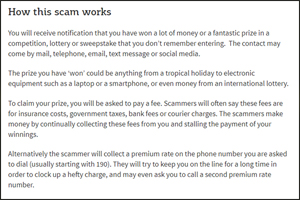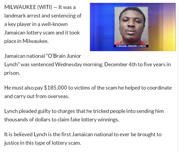 Below mentioned is a real time example of foreign lottery scam."O" Brain junior lynch a lottery scammer was sentenced to five years in prison for having scammed innocent people in the name of foreign lottery scam. He was also told to pay $185000 as a part of compensation to the victims.