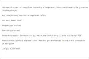 Don't be misled and conned by some infomercial scams that are not to be relied upon. Are they too good to be true though? Think twice, even before you pick up the phone to place an order. The clairvoyant crooks try to deceit you by closing the deal via a "1 +1" offer or "if you buy now" offer, a free complimentary gift is included into a "fitness deal", "baldness deal" that benefits them and only them. Before you shell out hundreds of dollars to get that "so-called" instant result of the product, think again. With all that said, within the infomercial industry, shipping & handling scam is one such type.
