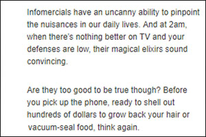 of our daily lives. Carefully scripted to exhilarate dopamine levels in your brain, infomercials take the viewers on a