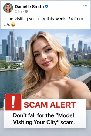 Another common scam involves someone claiming to be a model. She may tell you she has a modeling job scheduled in your city and suggests meeting while she’s there.