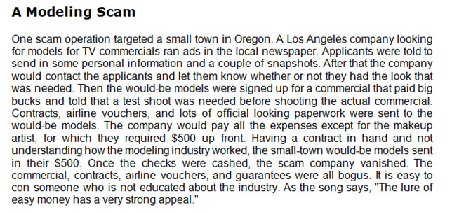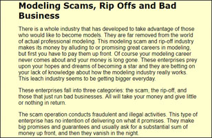 Someone approaches you at the shopping mall or center, claiming you have the potential to be a model. Considering that people have often complimented your ppearance, the allure of an enchanting career is hard to resist.