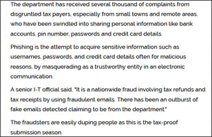 A prevalent scam making headlines is the New Tax Office Phishing Scam, where perpetrators impersonate tax authorities or officials. Victims receive well-crafted emails requesting substantial payments along with the provision of passwords and other sensitive personal information. Innocent recipients often fall prey to these scams, unknowingly providing the requested details. Within minutes of receiving the email, scammers clandestinely siphon off the entire amount, leaving victims in shock. Despite such scams becoming increasingly common, only a few people are aware of these fraudulent activities. It is crucial for businesses and corporations to stay informed by regularly checking the official tax authority website for updates on prevalent scams. Vigilance is key, and individuals should refrain from sharing vital information, such as internet user IDs and passwords. The income tax and revenue officials are taking stringent actions against scammers; however, their numbers continue to grow globally. Taxpayers receiving phishing emails should promptly report the matter to revenue officials or cybercrime authorities. Exercise caution during email transactions and avoid disclosing crucial financial details to strangers who may pose as responsible figures from governmental or financial agencies, attempting to steal individuals' data. Think wisely and refrain from sharing financial matters with strangers to prevent immediate loss of funds.