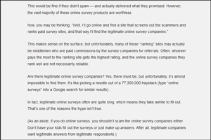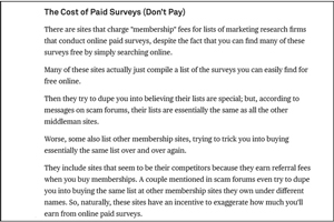 The following excerpt from Wikipedia showcases a screenshot of an online advertisement promoting paid surveys. Scammers employ enticing offers, promising attractive rewards and flexible working hours to lure users into trying these paid online surveys. The primary objective of these scammers is to plant the idea of trying out such surveys in the minds of potential victims. As individuals express interest in these opportunities, they are often asked to pay a nominal fee, purportedly refundable to the users.
