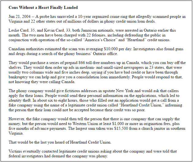 Leslie Card, 35, and Kevin Card, 33, both from Jamaica, were arrested in Ontario in January 2004 and charged with 22 felonies. They operated scams targeting people in Virginia and 22 other states, making millions of dollars through phony credit loan deals. Canadian authorities estimated their average daily scam earnings to be $10,000. Their tactics not only resulted in financial losses for victims but also exposed their personal details, leading to instances of identity theft. The largest reported amount scammed was $15,500 from a church janitor in Virginia.