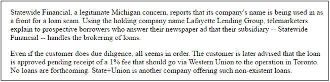 Statewide Financial, a subsidiary company of Lafayette Lending Group, reported that its name is being fraudulently used to deceive customers in the guise of an advance fee loan. In this scam, customers are advised to pay a 1% fee to the company via Western Union for the loans to be approved.