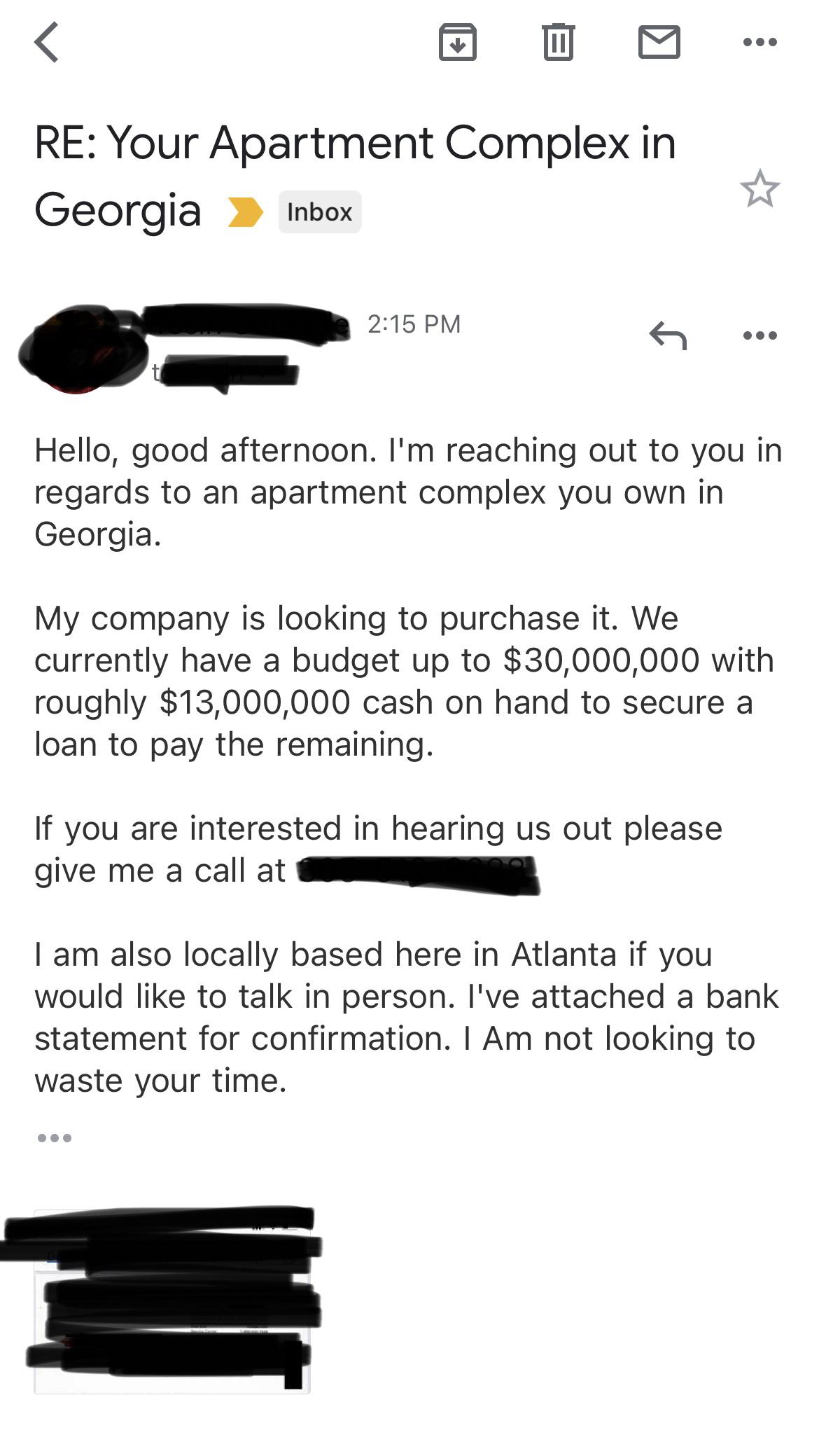 I received this email today inquiring about purchasing an apartment complex I do not own.